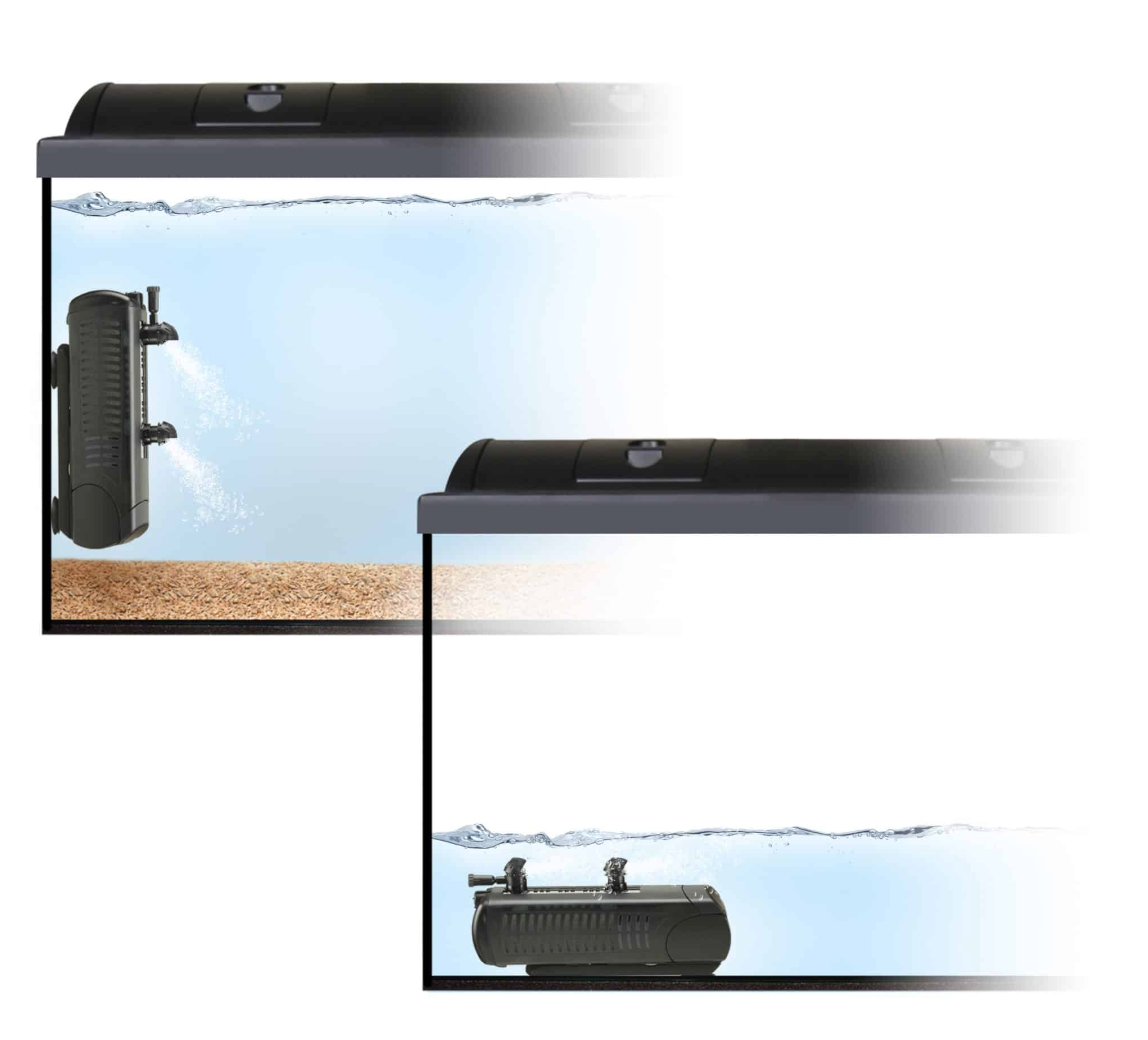 -Position horizontally for shallow tanks, larger tanks with low water levels, or to create a decorative waterfall feature